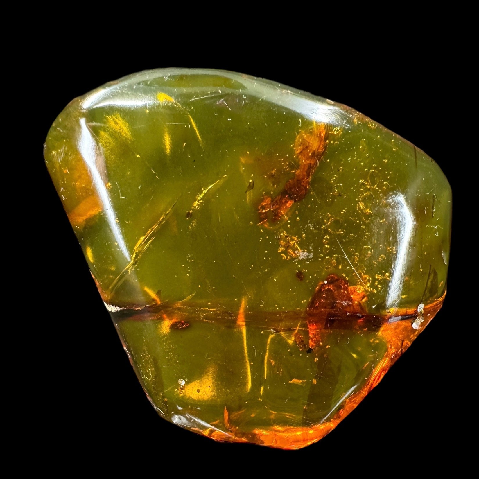 Amber is the fossilized resinous tree sap from conifer trees, which over the course of millions of years becomes solid while retaining the semitransparent yellowish hue of tree sap. While in its sticky gel state, it is not uncommon for insects and other small animals to become trapped within tree sap, and under optimal conditions these insects will be clearly visible within the fossilized amber pieces. These high quality and exceptional color Chiapan Amber originated in Mexico during the Oligocene, roughly 20 million years ago. Each contains at least one (most several) clearly visible insect.