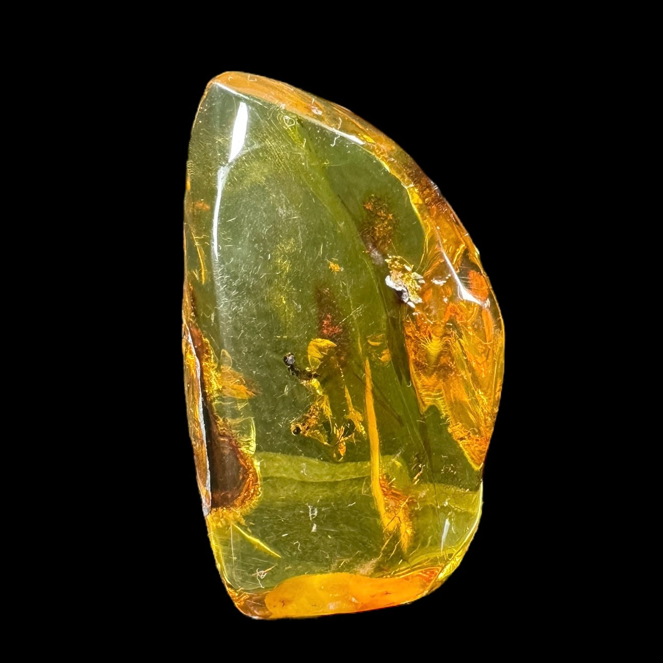 Amber is the fossilized resinous tree sap from conifer trees, which over the course of millions of years becomes solid while retaining the semitransparent yellowish hue of tree sap. While in its sticky gel state, it is not uncommon for insects and other small animals to become trapped within tree sap, and under optimal conditions these insects will be clearly visible within the fossilized amber pieces. These high quality and exceptional color Chiapan Amber originated in Mexico during the Oligocene, roughly 20 million years ago. Each contains at least one (most several) clearly visible insect.