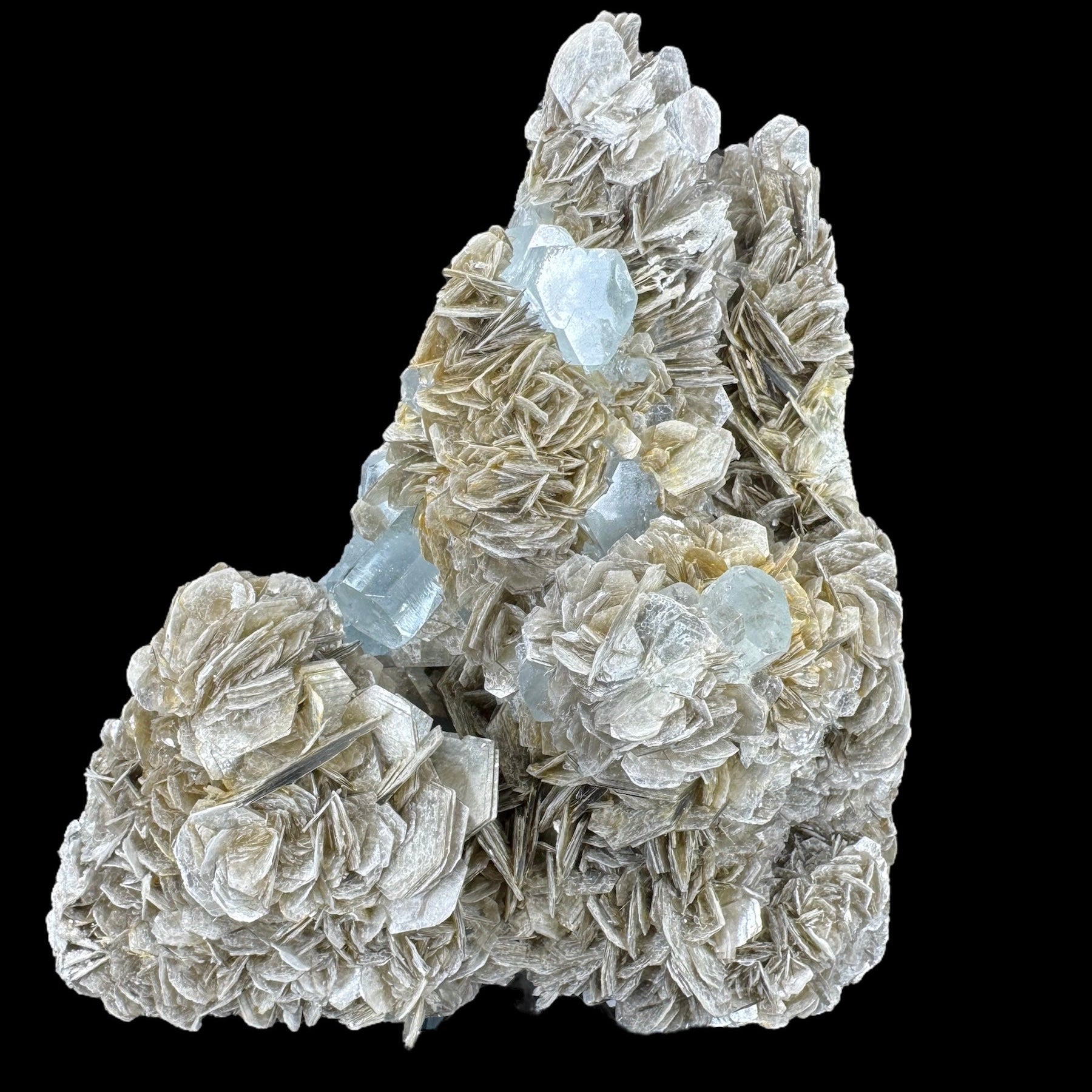 This large, one-of-a-kind show piece contains multiple pieces of large natural uncut aquamarine with high clarity and exceptional hue. They are found within a stunning large cut of thick mica rosettes, the slight yellow tint of which perfectly highlights the sea green crystals. An unparalleled collector's piece.Â