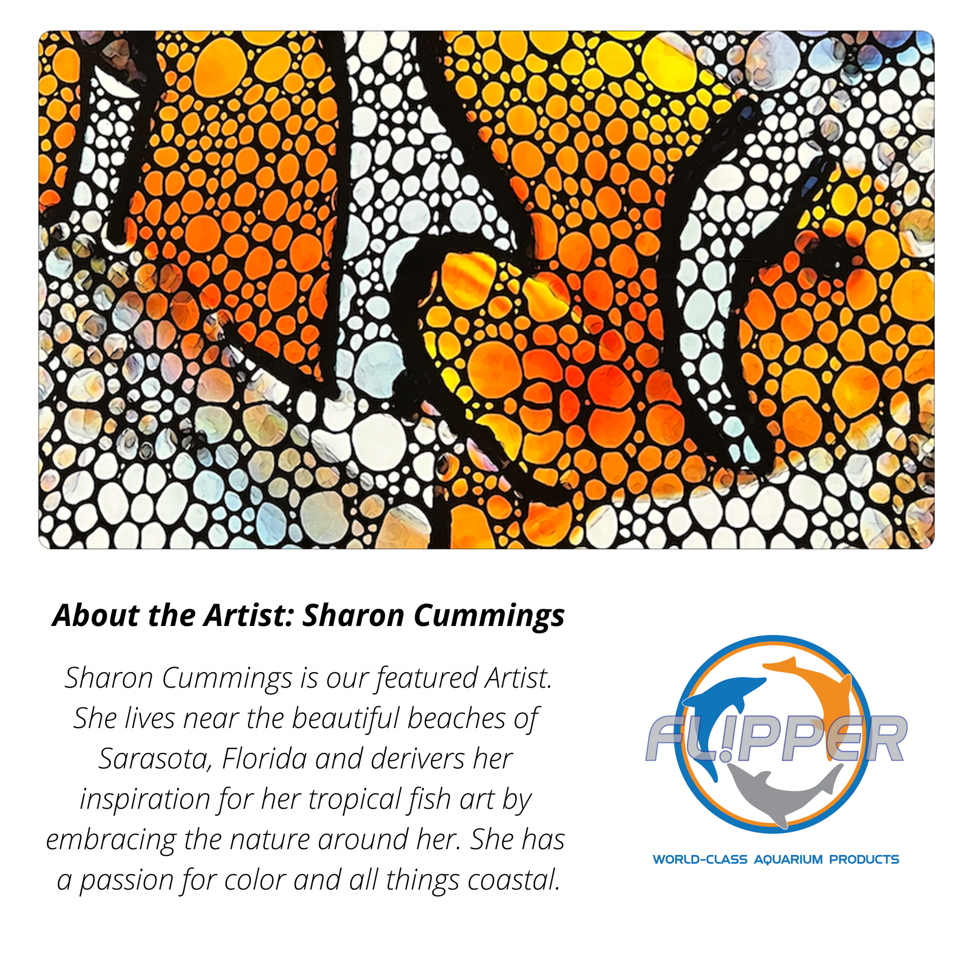 - FEATURED ARTIST - Sharon Cummings is our featured artist. She lives near the beautiful beaches of Sarasota, Florida and derives her inspiration for her tropical fish art by embracing the nature around her. She has a passion for color and all things coastal.