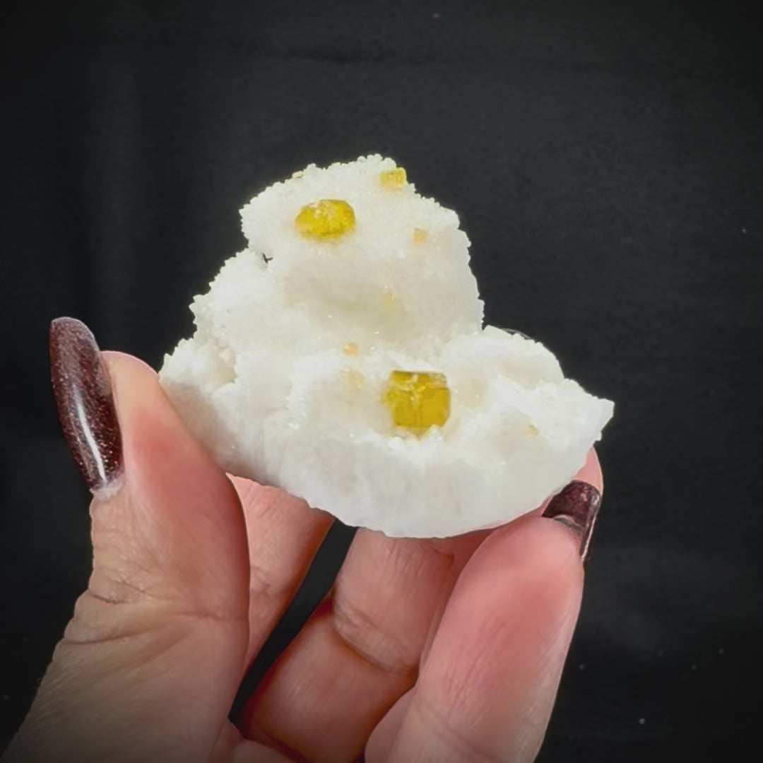 Barite is a mineral with an interesting history, a crystal occurring in a wide variety of colors and forms. Named for the Greek word for “heavy”, it is largely mined as an industrial ore across the globe, with uses in various industries including oil drilling. As a mineral specimen or gemstone Barite can be found in many colors including vibrant reds, pinks, and blues as well as the more commonly encountered clear or pale white. These fine specimens have rich yellow-gold fine crystals covering a thick white matrix.