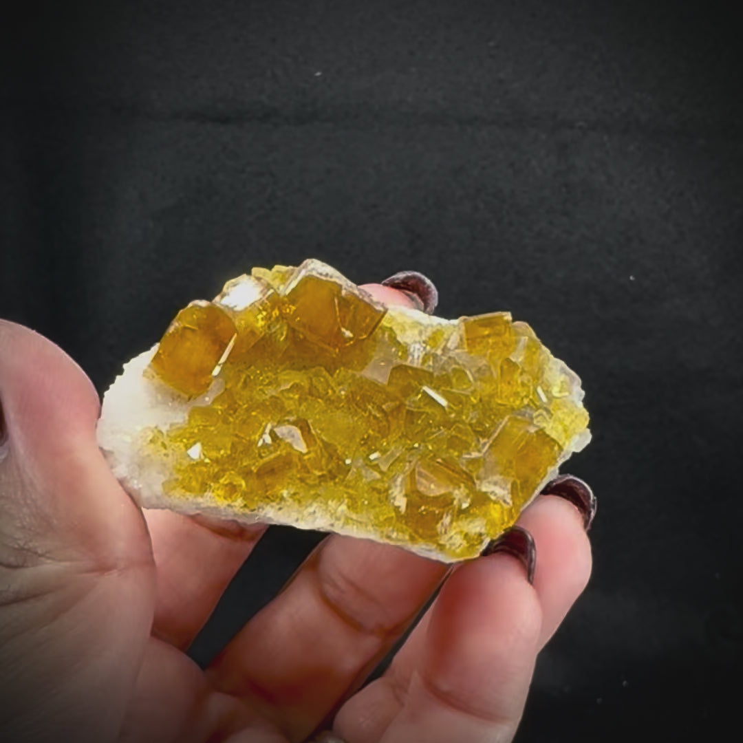 Barite is a mineral with an interesting history, a crystal occurring in a wide variety of colors and forms. Named for the Greek word for “heavy”, it is largely mined as an industrial ore across the globe, with uses in various industries including oil drilling. As a mineral specimen or gemstone Barite can be found in many colors including vibrant reds, pinks, and blues as well as the more commonly encountered clear or pale white. These fine specimens have rich yellow-gold fine crystals covering a thick white matrix.