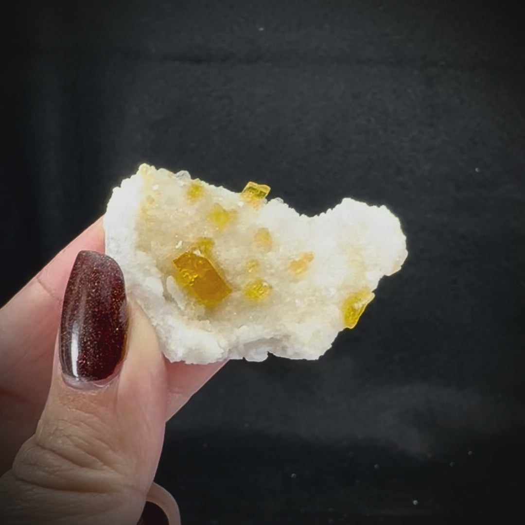 Barite is a mineral with an interesting history, a crystal occurring in a wide variety of colors and forms. Named for the Greek word for “heavy”, it is largely mined as an industrial ore across the globe, with uses in various industries including oil drilling. As a mineral specimen or gemstone Barite can be found in many colors including vibrant reds, pinks, and blues as well as the more commonly encountered clear or pale white. These fine specimens have rich yellow-gold fine crystals covering a thick white matrix.