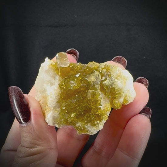 Barite is a mineral with an interesting history, a crystal occurring in a wide variety of colors and forms. Named for the Greek word for “heavy”, it is largely mined as an industrial ore across the globe, with uses in various industries including oil drilling. As a mineral specimen or gemstone Barite can be found in many colors including vibrant reds, pinks, and blues as well as the more commonly encountered clear or pale white. These fine specimens have rich yellow-gold fine crystals covering a thick white matrix.