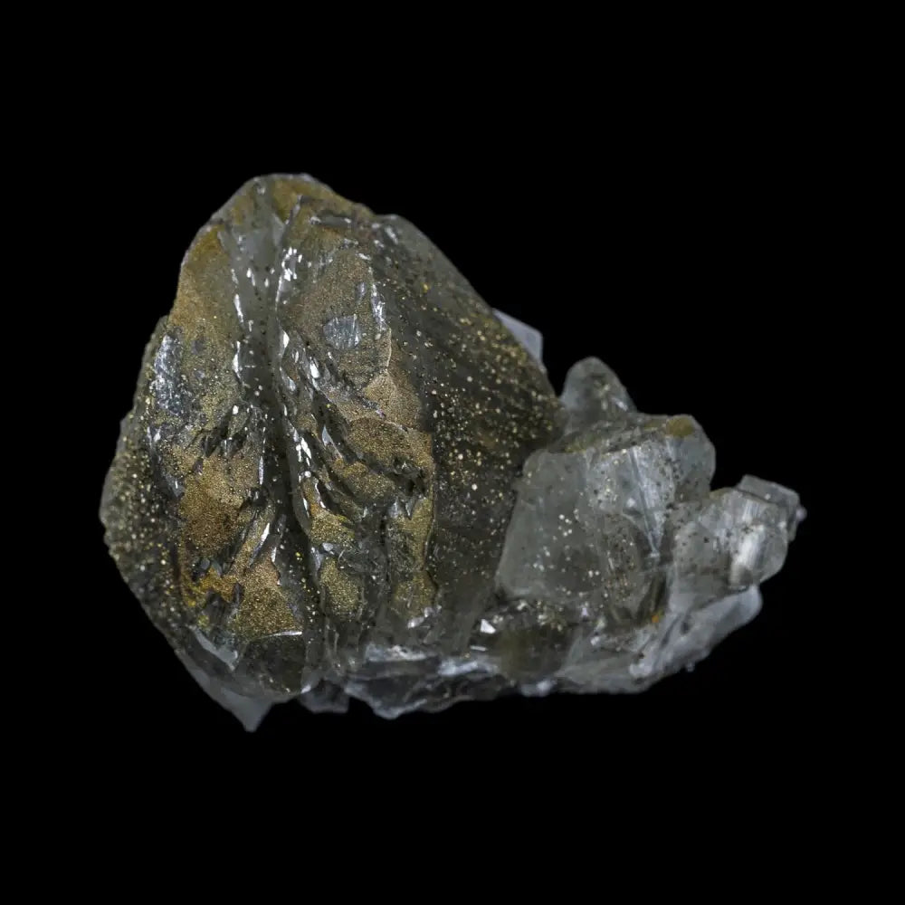 A relatively new and exciting addition to the mineral world, the so-called “Benz” calcite comes from specific formations in Hubei, China, where some truly impressive specimens like this very rarely emerge from the mines. These incredible collector’s pieces – each one of a kind – feature massive semitransparent calcite crystals, many of which feature coatings of fine, incredibly brilliant pyrite and chalcopyrite. The “Benz” part of the name comes from the tip of some calcite crystals which have a clearly defined three-pointed star of pyrite, reminiscent of the famed logo of Mercedez Benz. The unique combination of smoky, large calcite crystals and the dusting of fine gold from the pyrite is unique to specimens from this specific region of China and have not been found anywhere else.
