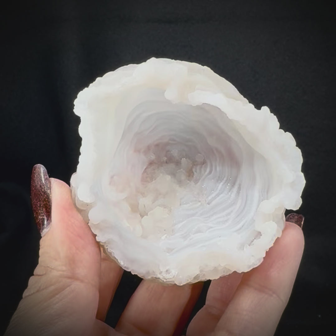 A silicone-based mineral closely related to quartz and agate, Chalcedony has a unique crystalline structure that gives it an enormously variable appearance. This mineral forms in a similar fashion to agates and geodes but due to heat and pressure at the time of formation results in a distinct look and almost silky texture. Chalcedony can be found in a range of colors but most often occurs in semitransparent or white. It has a long archaeological record of human use as a cutting or carving tool, dating back as far as 32,000 BC. Chalcedony has a number of forms that are also considered gems of their own, such as agates, carnelian, and onyx. These unique, highly variable Chalcedony spheres or roses are almost geode-like in appearance and one can clearly see the process of geode or agate formation in progress in each specimen.
