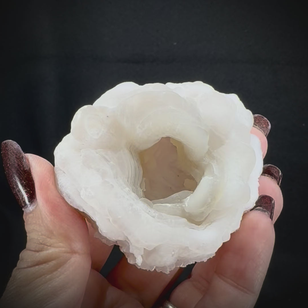 A silicone-based mineral closely related to quartz and agate, Chalcedony has a unique crystalline structure that gives it an enormously variable appearance. This mineral forms in a similar fashion to agates and geodes but due to heat and pressure at the time of formation results in a distinct look and almost silky texture. Chalcedony can be found in a range of colors but most often occurs in semitransparent or white. It has a long archaeological record of human use as a cutting or carving tool, dating back as far as 32,000 BC. Chalcedony has a number of forms that are also considered gems of their own, such as agates, carnelian, and onyx. These unique, highly variable Chalcedony spheres or roses are almost geode-like in appearance and one can clearly see the process of geode or agate formation in progress in each specimen.