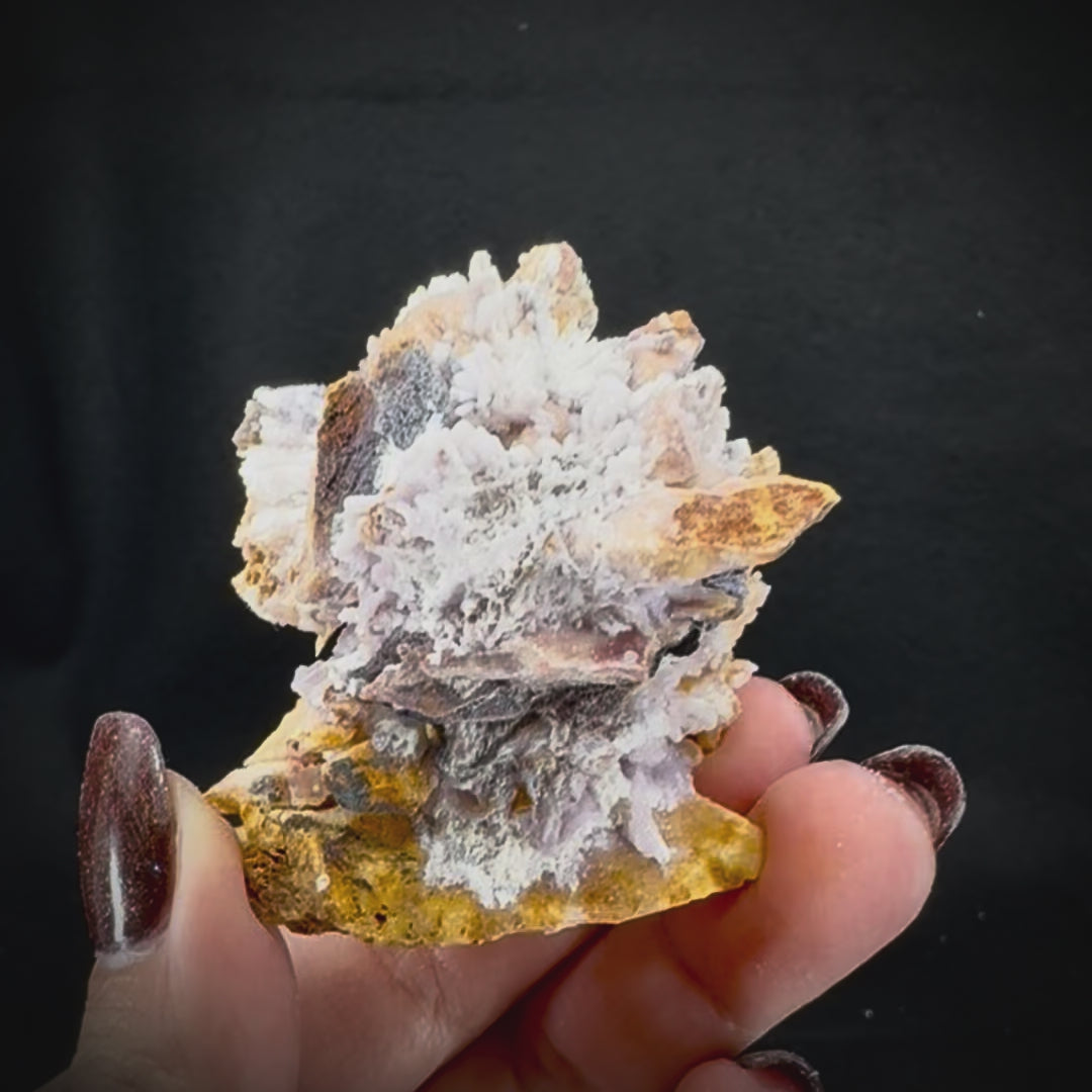 Known for its beautiful prismatic crystals, often radiating outward from a central axis, Creedite is named for the place of its initial discovery, the Creede Quadrangle in Colorado. Creedite is a rare mineral in the hydoxylhalide group and is often formed from the intense oxidation of fluorite formations. Only known from a relatively small number of formations worldwide, Creedite is sought after for its unique fine crystalline structure.