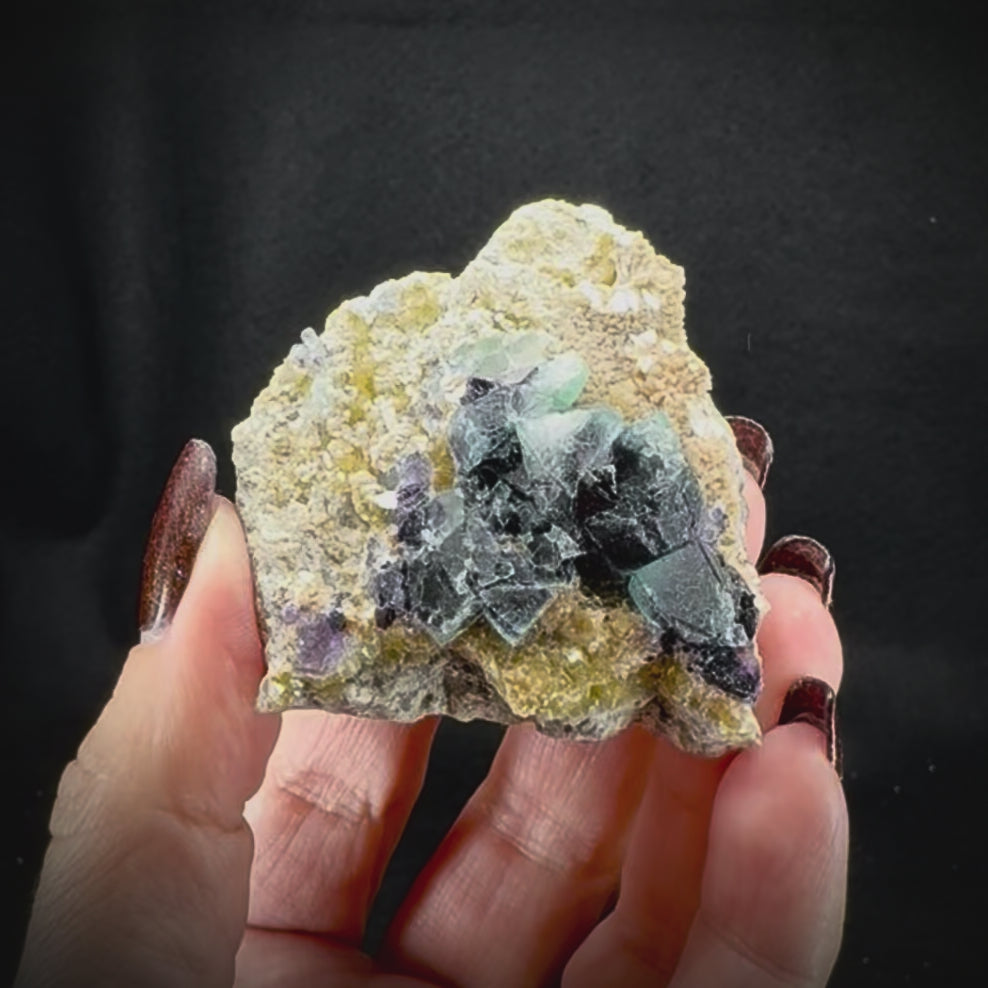 These highly variable pieces contain Fluorite crystal clusters within different matrixes, including feldspar, fine quartz crystals, botryoidal quartz, and other materials all originating from the Yindu Mine in Inner Mongolia, China. No two are alike, and each has its own unique distinct character.Â
