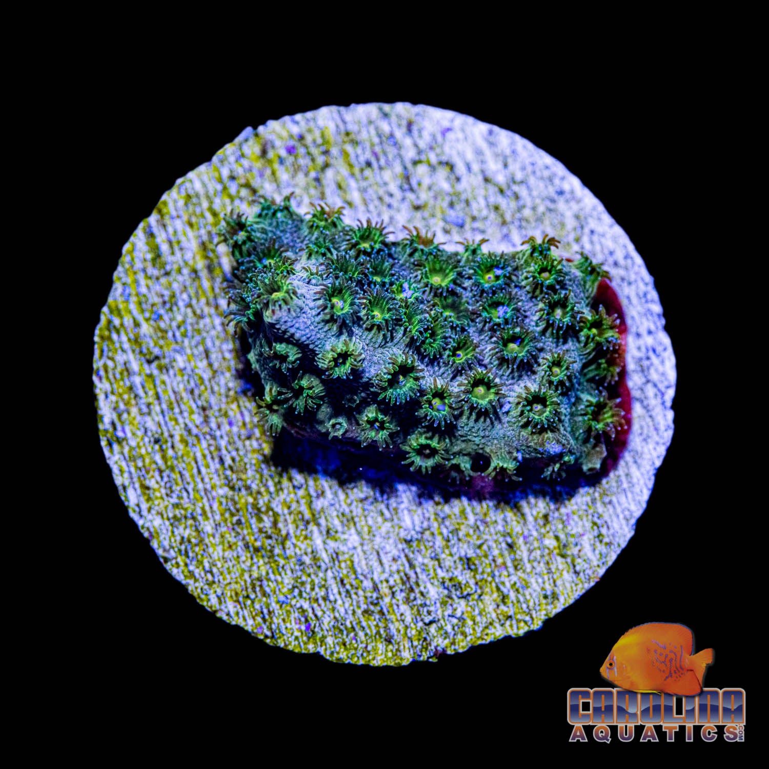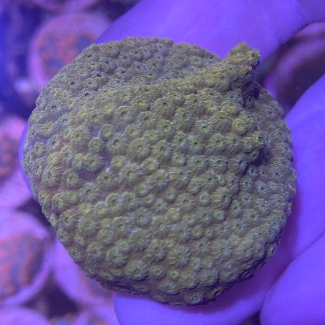 Login to view price.This is a fast-growing Cyphastrea sp. that is yellow gold in color. Along the growing edge the inter-polyp area (coenosarc) appears blue in color. This coral has an encrusting growth form, and does best in low to moderate light intensity. On 1-1/4” Frag Plug