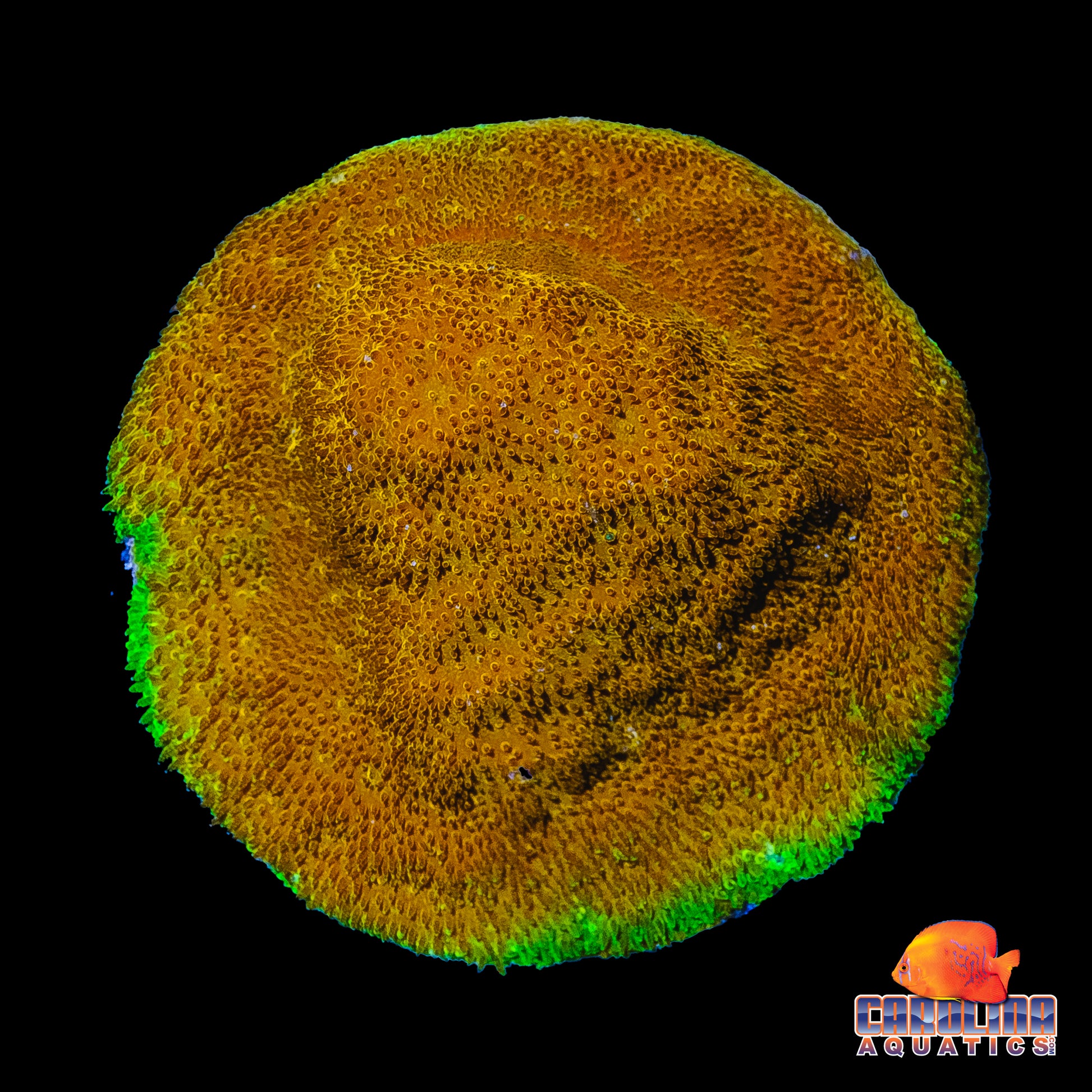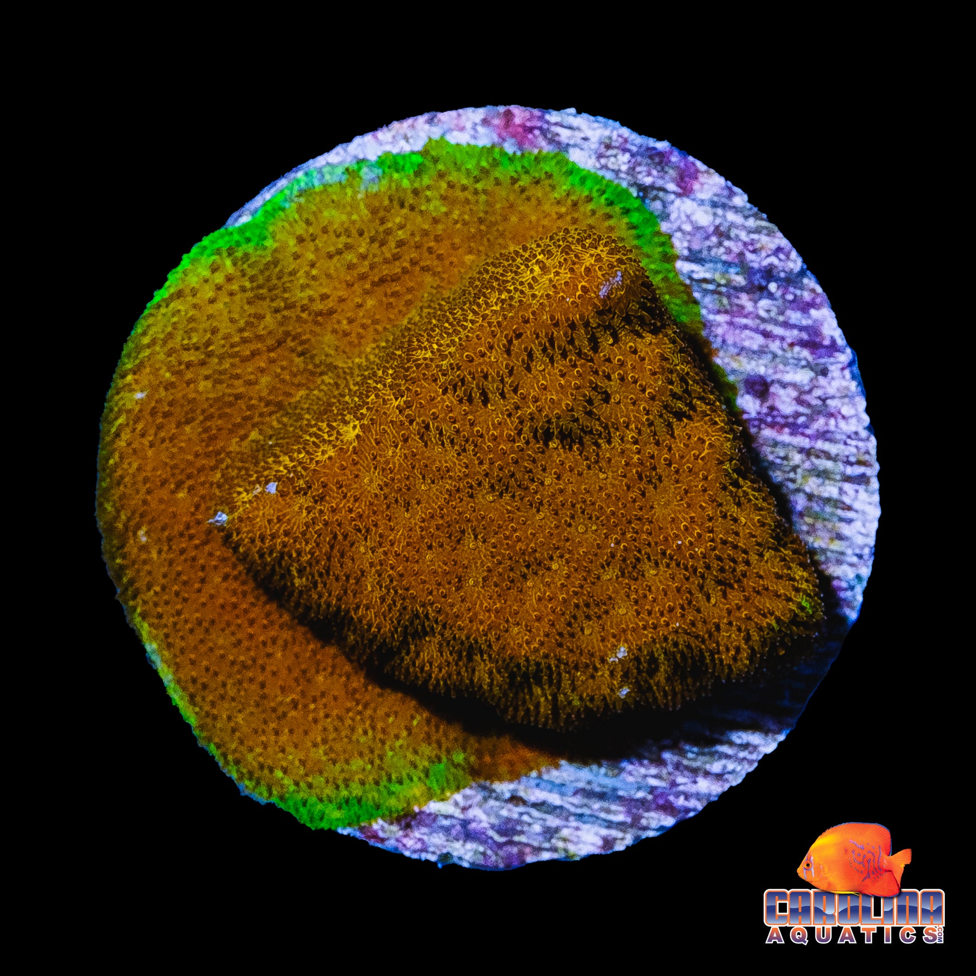 Login to view price.This Psammacora sp. coral is fast growing encrusting coral. The base color is orange, while the actively growing edge is neon green. This coral does best in moderate to high light intensity. On a 1-1/4” Frag Plug