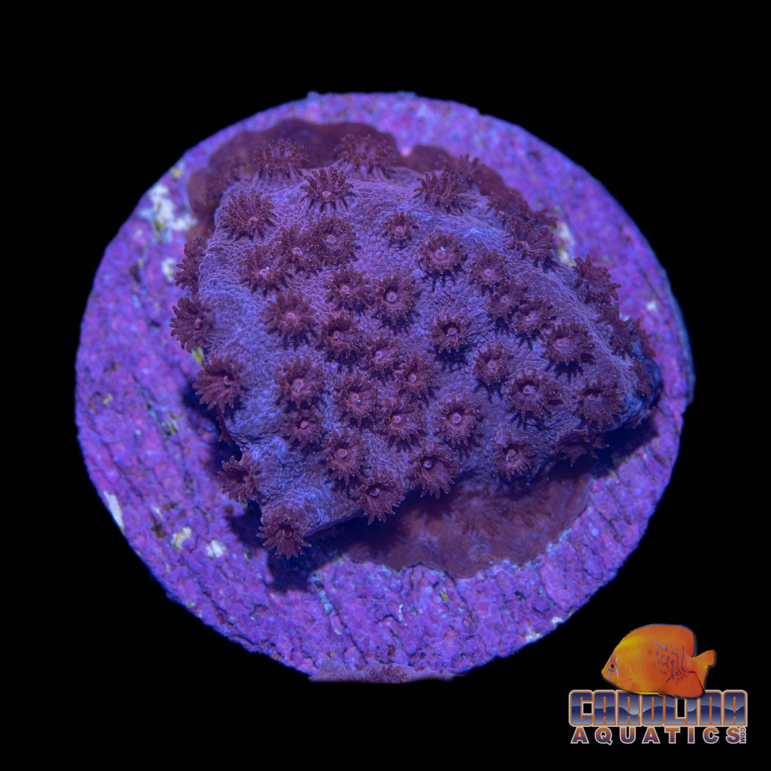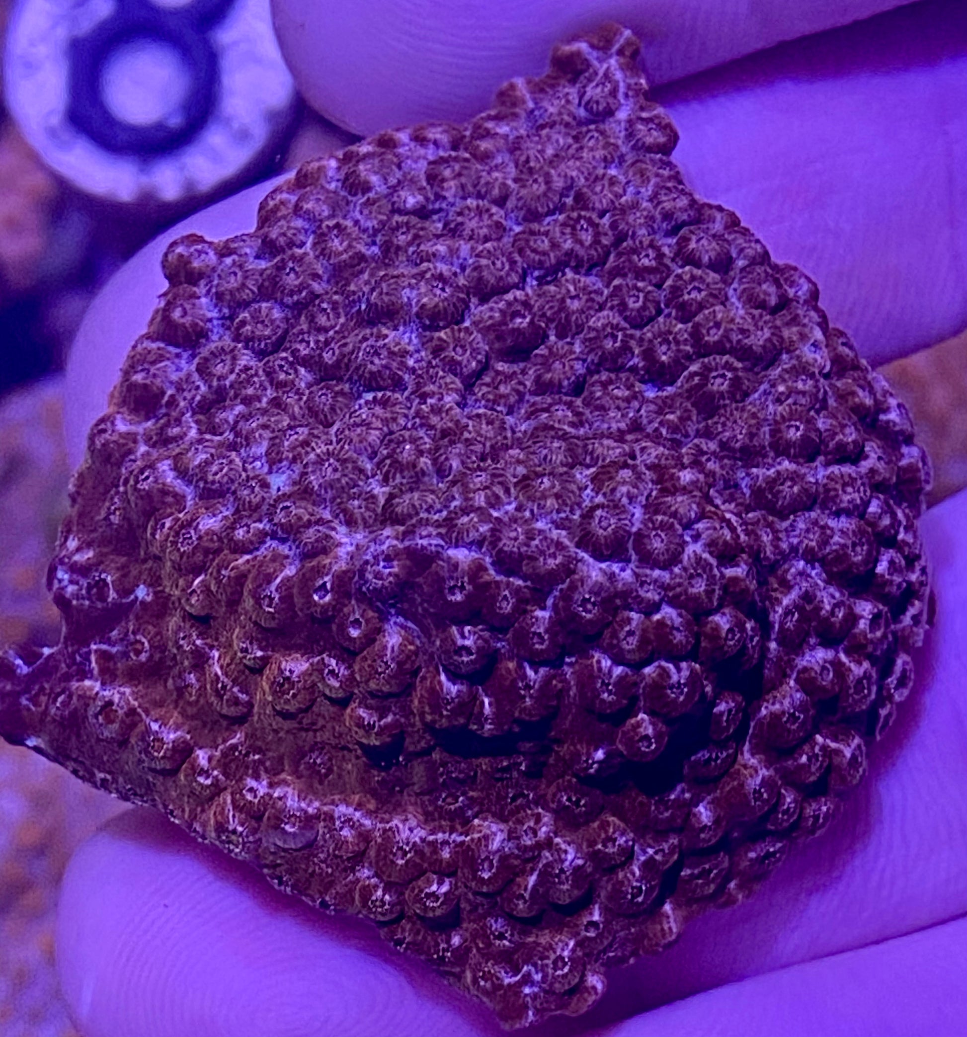Login to view price.This Cyphastrea sp. has a purple base color with a mosaic of bronze, white, and violet accents. Does best in lower light intensity. On a 1-1/4” Frag Plug