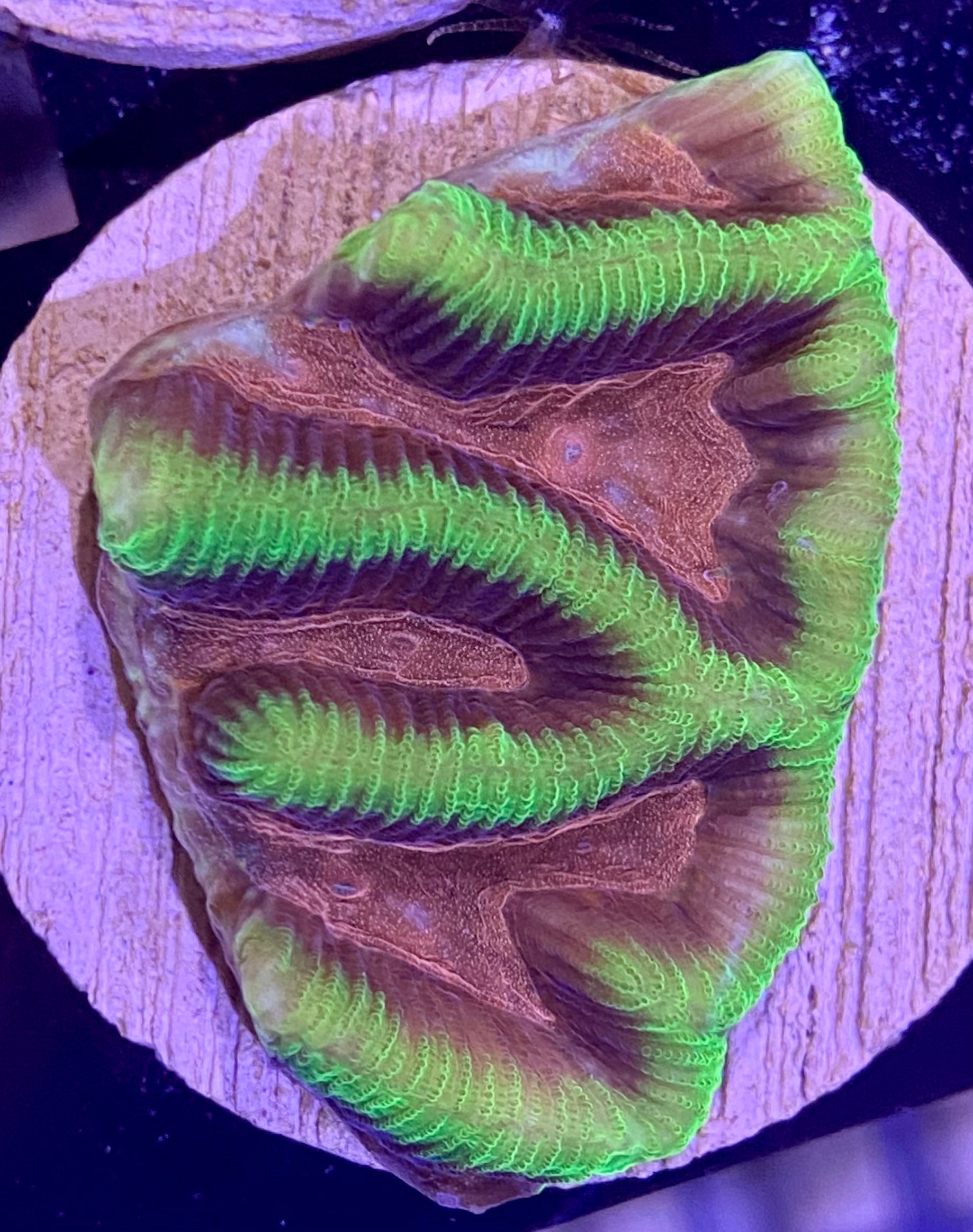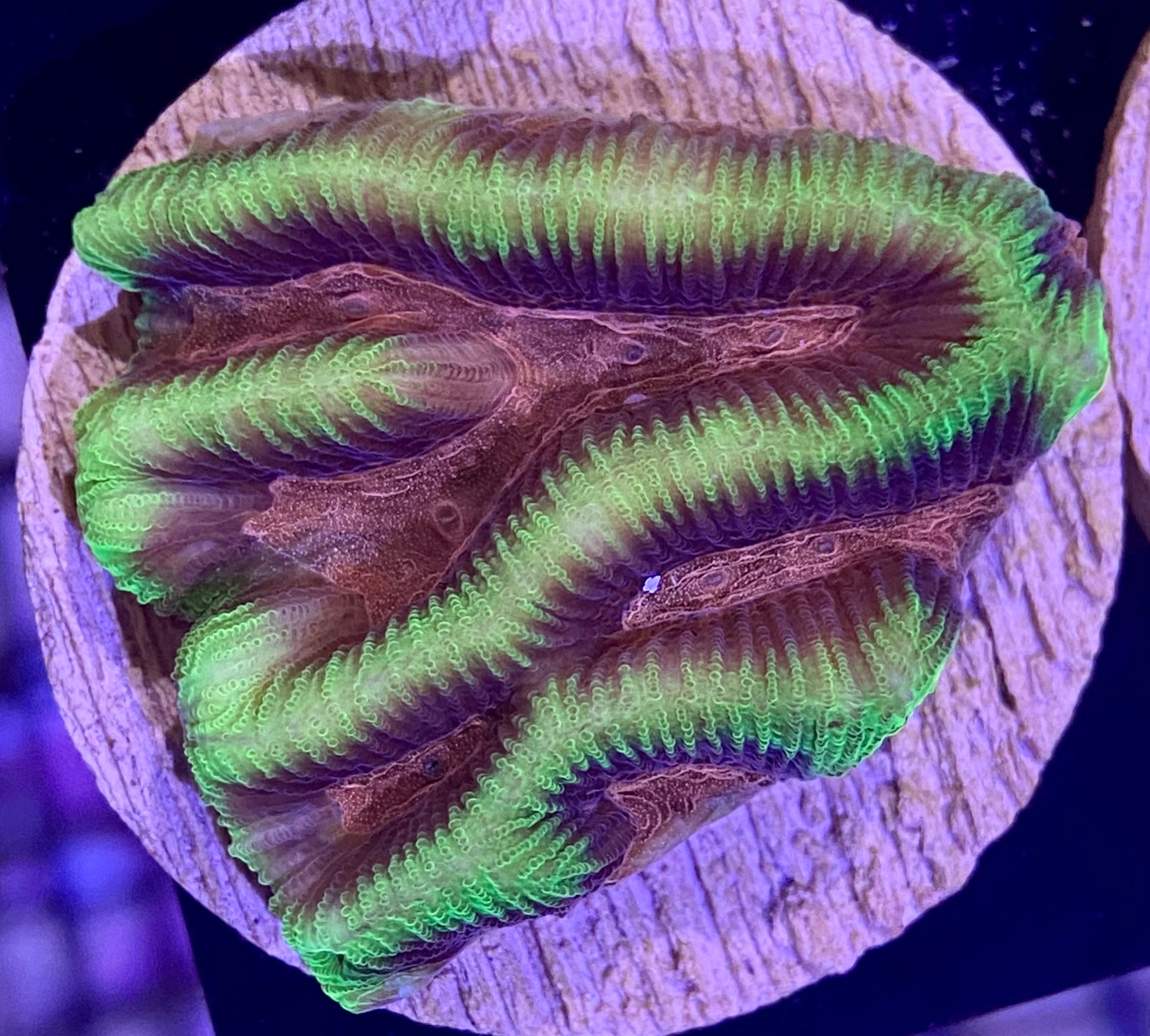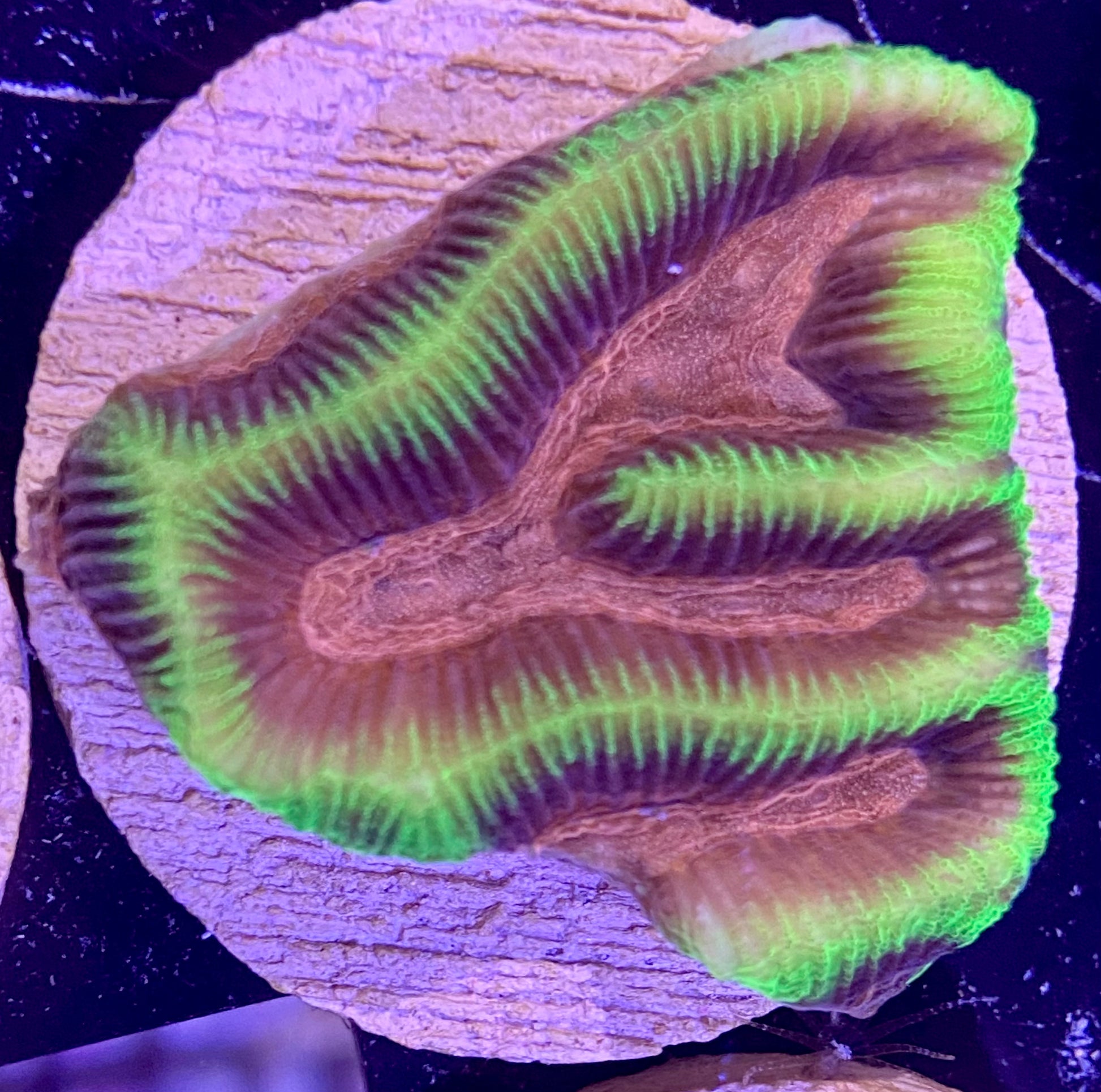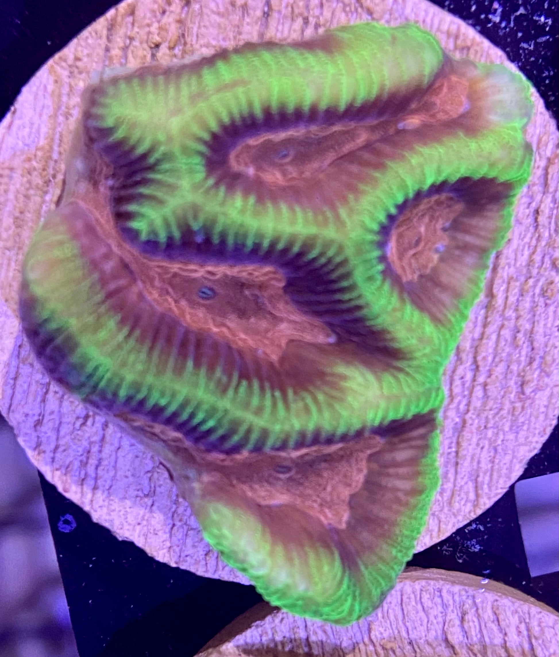Login to view price.This Platygyra sp. maze brain coral features pinkish red polyps with sparkly highlights. The ridges separating the polyps are yellow. Does best in moderate light intensity. On 1-1/4” Frag Plug