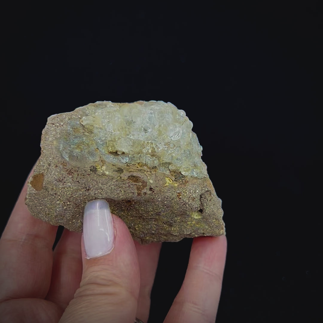 Hyalite or Jalite is a form of opal that due to its chemical composition lacks the sought after colorful iridescence of its more sought after precious stone relative. Hyalite is unique in its own right, however, especially due to its highly fluorescent or UV reactive nature. Typically found in intricate, botryoidal crystal formations, Hyalite is usually clear but can have some color due to the presence of impurities.
