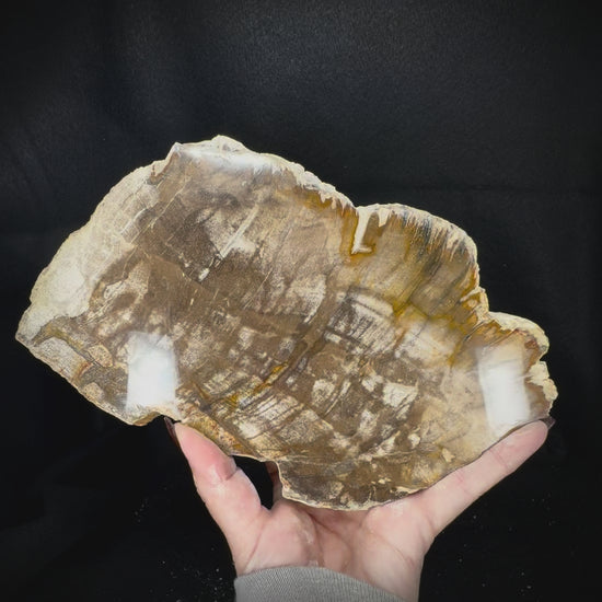 Perhaps the most well-known fossil material in the world, petrified wood is not wood at all but rather the fossilized remnants of trees from millions of years ago. Tree trunks, limbs, and branches that died under conditions that favor fossilization gradually become replaced with minerals until what remains is a replica of the original piece of wood consisting entirely of mineral material. Like the trees they capture the form of, each is unique and when cut vertically can reveal a cross section of the tree, sometimes including growth rings. Depending on the minerals present during fossilization, petrified wood can display an enormous variety of colors, textures and patterns. Each of these cut and polished slabs originates from Indonesia and is approximately 20-23 million years old.