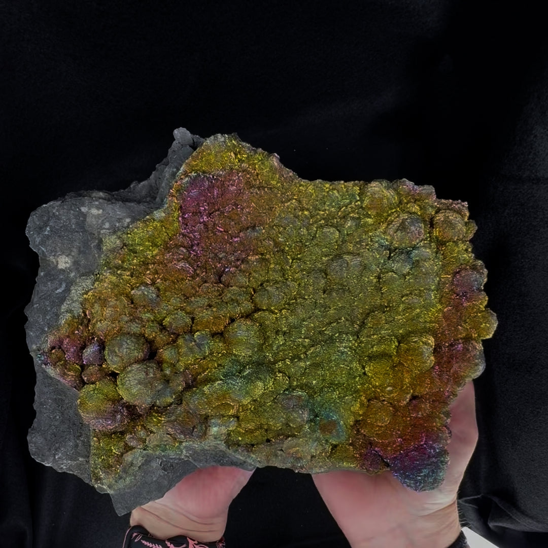 Rainbow or peacock pyrite is a much rarer form of pyrite named for the unmistakable and incredibly vibrant rainbow-colored iridescence it displays. The spectacular display of colors these specimens display can be formed by two different geological processes: the oxidation of pyrite causing ultra-thin layers of iron oxide to form on the surface, or the formation of equally thin layers of secondary minerals due to hydrothermal or other alteration. This naturally occurring form of relatively common pyrite remains highly sought after by collectors as a specimen or for use as a gem or in jewelry.