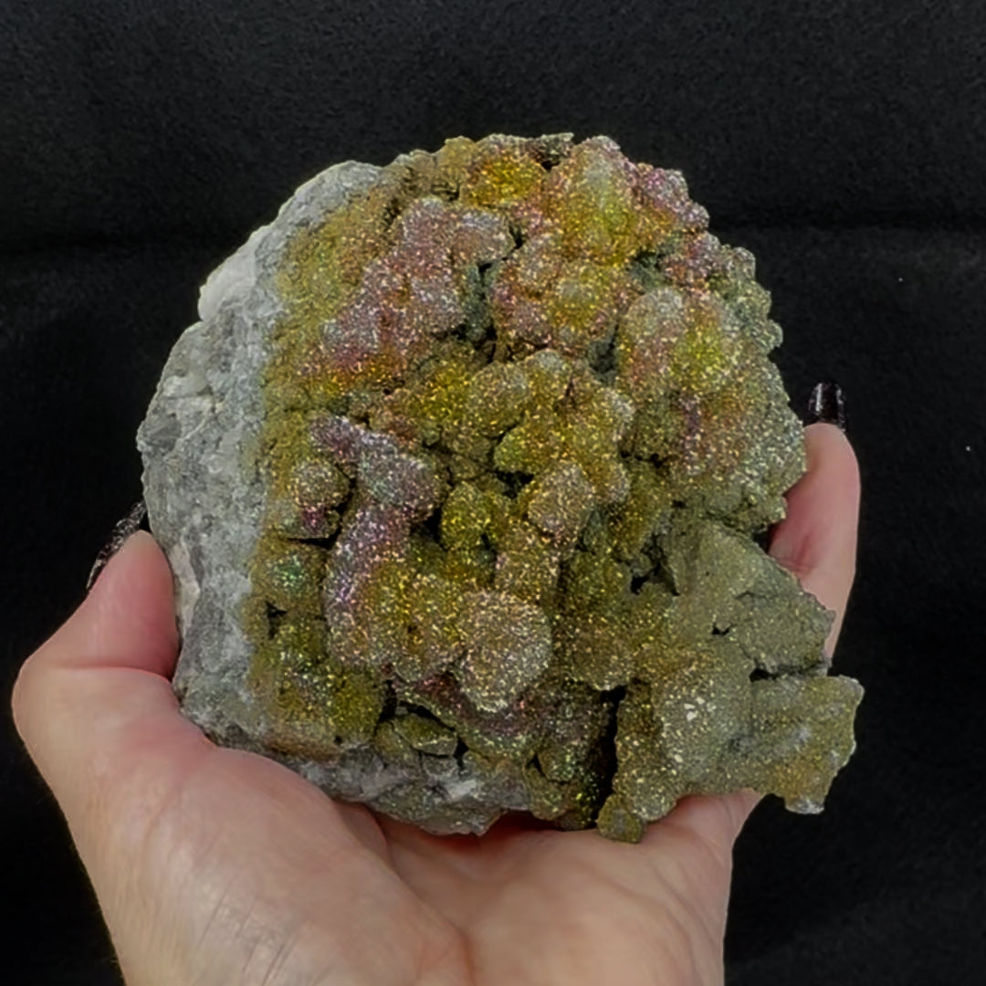 Rainbow or peacock pyrite is a much rarer form of pyrite named for the unmistakable and incredibly vibrant rainbow-colored iridescence it displays. The spectacular display of colors these specimens display can be formed by two different geological processes: the oxidation of pyrite causing ultra-thin layers of iron oxide to form on the surface, or the formation of equally thin layers of secondary minerals due to hydrothermal or other alteration. This naturally occurring form of relatively common pyrite remains highly sought after by collectors as a specimen or for use as a gem or in jewelry.