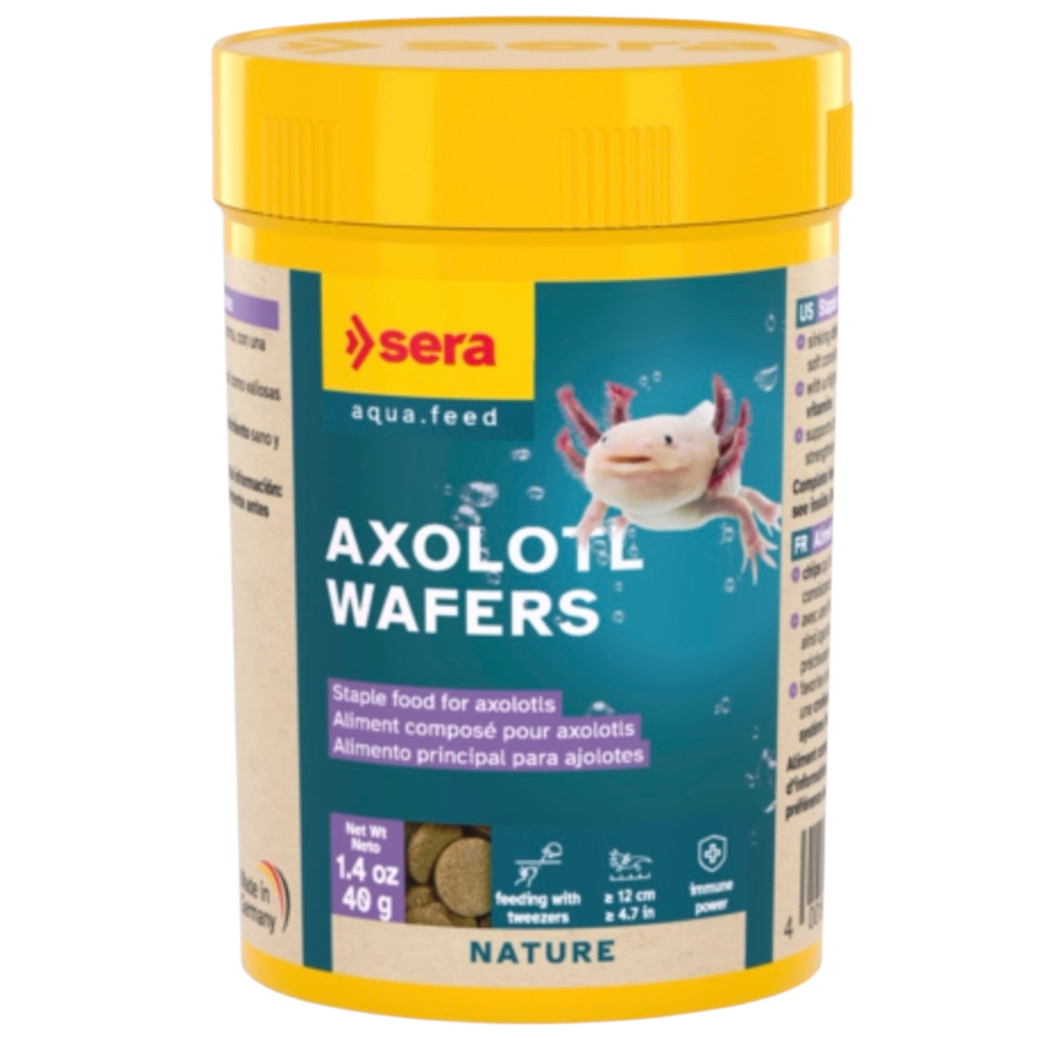 Axolotls are ambush predators, which means that they remain in their hiding places before ambushing their prey when it comes near. In their natural habitat, axolotls eat, e.g. small fish, worms, shrimps and insect larvae. The sera food contains a high percentage of protein and was specially developed to meet the requirements of young and adult axolotls above 12 cm. Due to the combination with prebiotic ingredients, the staple food supports healthy growth and strengthens the immune system.