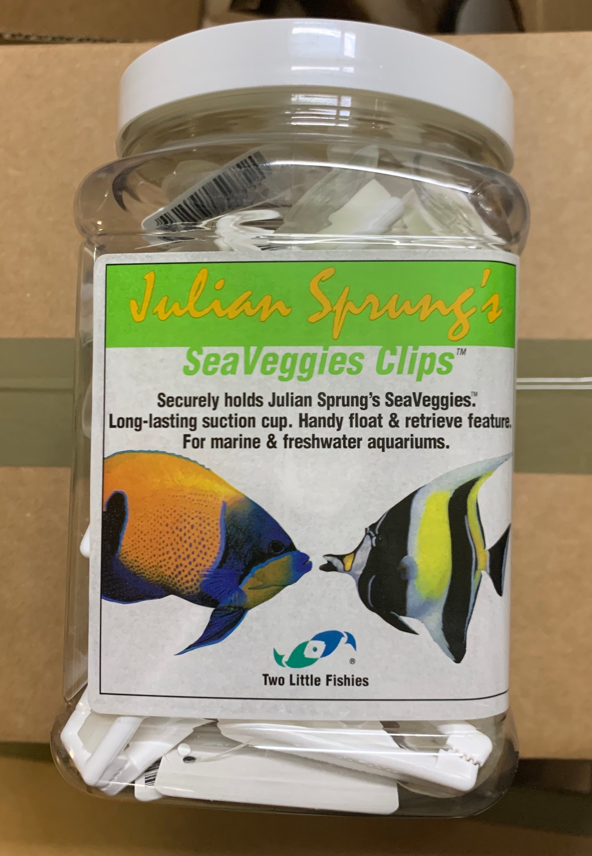 Unique plastic clip with a large suction cup that securely holds Julian Sprung's SeaVeggies with a powerful grip. Attaches easily and holds firmly to the aquarium glass. Unlike other clips, ours floats, so it is easy to retrieve and won't get lost in the aquarium decorations. No metal parts. For marine & freshwater aquariums. Available singly on a card, in Bulk, or in P.O.P display jar.