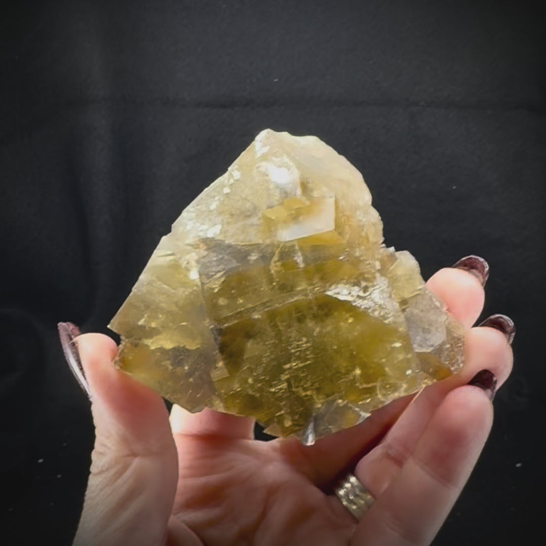 These remarkable yellow fluorite crystals originate from China and range in color from rich honey to pastel gold, some with highlights of purple or blue around the outer edges.